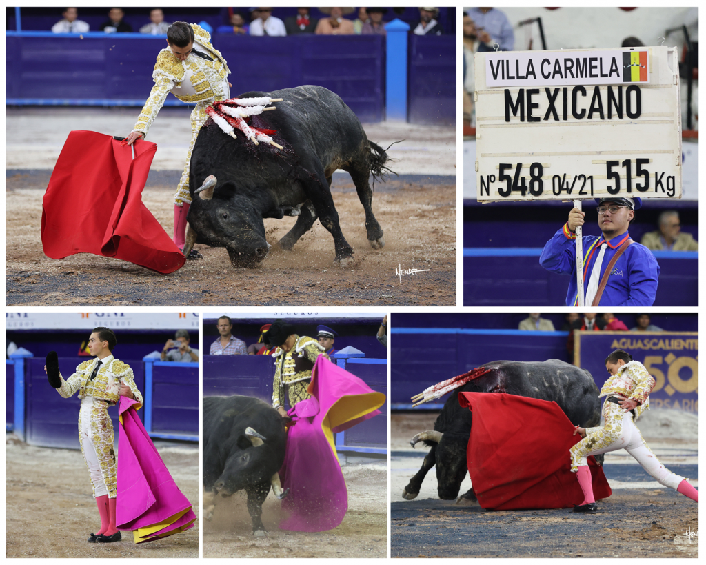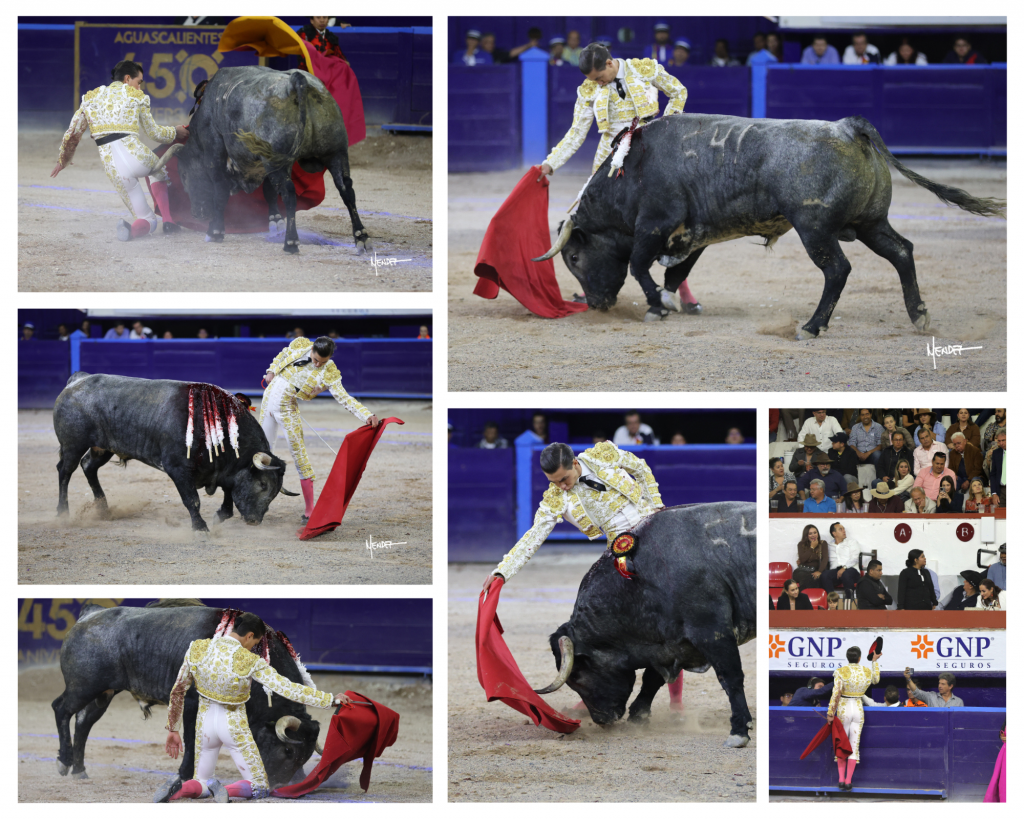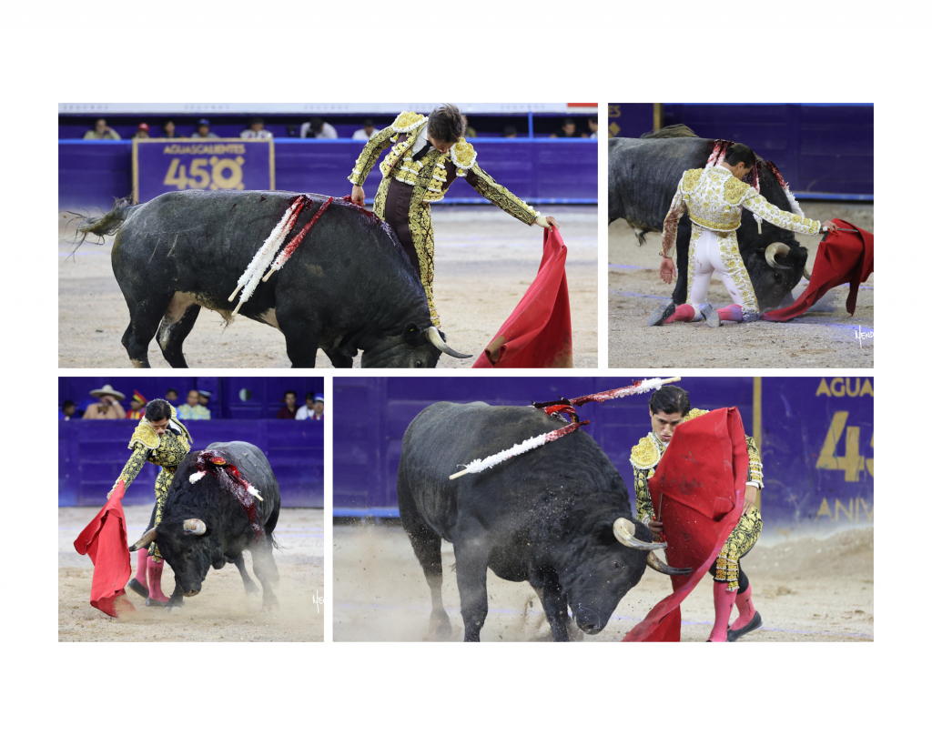 En el toro que abrió plaza, llamado “Aniversario”, marcado con el número 540 y con 498 kilos, no fácil, reservón y desarrollando sentido, el toricantano mexiqueño Bruno Aloi se dejó ver empeñoso en el manejo del capote. Buena vara del piquero Miguel Cobos. Vino la emotiva ceremonia de graduación torera al cederle el limeño Andrés Roca Rey los trastos de matador de toros a Bruno y ante la presencia de Luis David Adame. Realizada la cesión, brindó a su apoderado español Justo Jiménez y, con la muleta, Aloi empezó caminándole del tercio a los medios con trincherazos y los de la firma, siguiendo por derechazos esforzado y aguantando hasta sufrir un susto. Persistió por ese lado en plan torero y de mucha seriedad. Al natural le echó valor. Se la siguió jugando por el derecho, pudiéndole de verdad al complicado burel y acortando distancia con sereno valor. Doblones mandones para cerrar y mató de pinchazo y estocada honda trasera para ser aplaudido con fuerza en el tercio.
